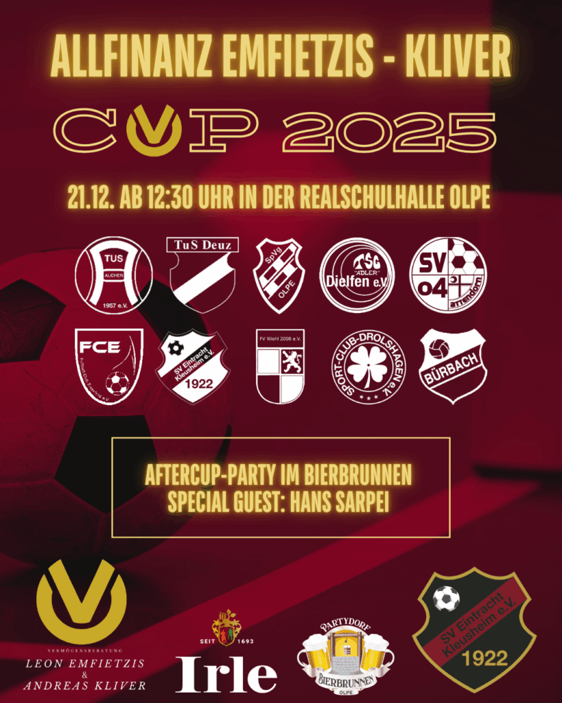 Allfinanz Emfietzis – Kliver CUP 2025 Veröffentlicht am Dezember 1, 2025Dezember 1, 2025 von SV Eintracht Kleusheim e.V. 🎤 Das Finale wird moderiert von: Hans Sarpei !🍻🎉 inkl. AfterCup-Party im Bierbrunnen Olpe – die ersten 200 Zuschauer erhalten eine Freikarte für die Party!🏃♂️💨🎟️ Wir freuen uns auf euch! 🖤❤️🦅